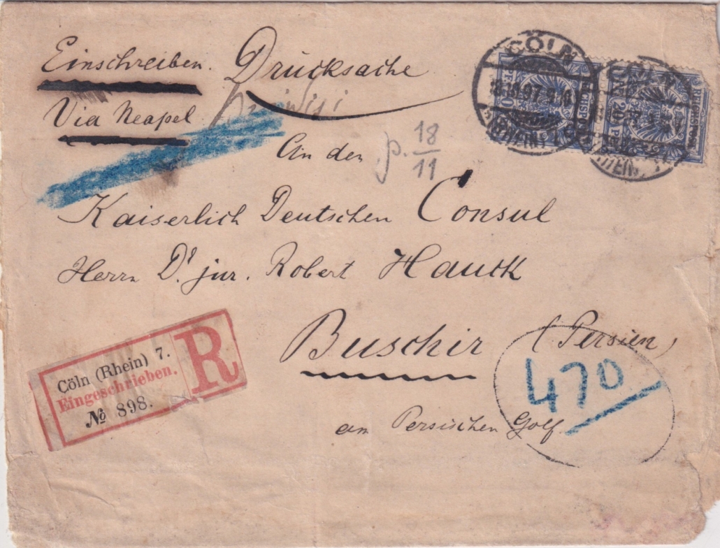 Nachfolgend gezeigtes eingeschriebenes Drucksachenstreifband in der 4. Gewichtsstufe wurde am 18.10.1897 von Köln über Neapel und Brindisi nach Buschir am Persischen Golf (seinerzeit Persien, heute Iran) gesendet. Das Ankunftsdatum der Sendung ist leider nicht zu erkennen.